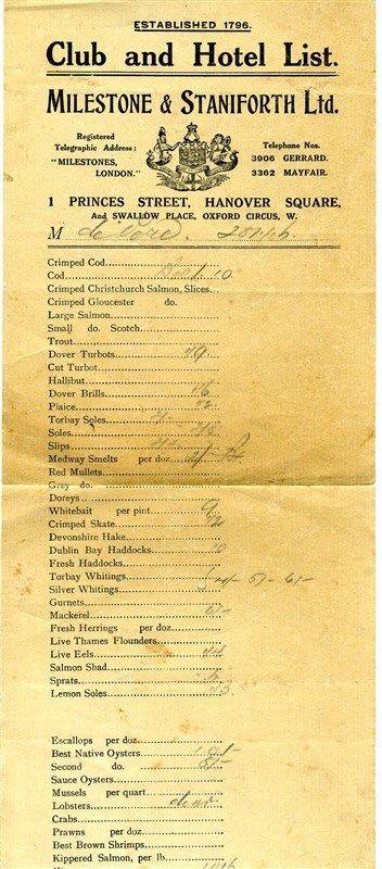 Milestone & Staniforth Ltd Fresh Seafood Menu Swallow Place London 1915