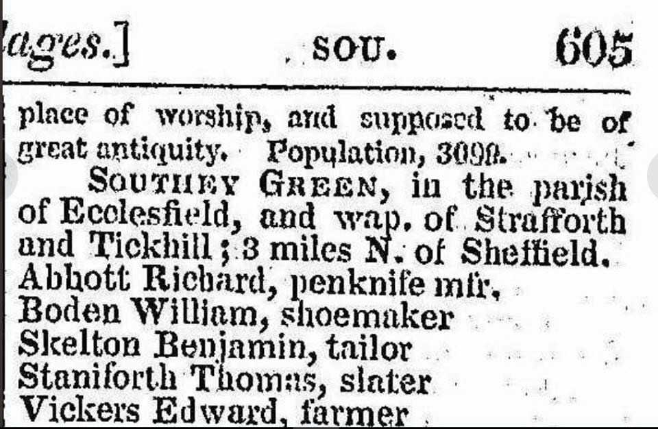 On the 1881 Census, the family is still at Attercliffe, Joel is now 66 and has changed his occupation to Carter, rather than describing himself as being from Southey Green, he is instead from Ecclesfield, the parish that includes Southey Green. His wife is 65 and Walter Staniforth is again the only son in the household, by now he is a 25 year old Labourer. Two grandchildren, Edith Jepson, aged 8 and Herbert Jepson, aged 6 are also in the household.