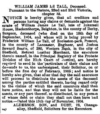 Frederick Tindall Le Tall, born 1846, married Eleanor M Hawson, a Scarborough woman, he passed away on November 20th 1887 and she took the kids to Scarborough, the only son was Frederick William Le Tall born 1872.