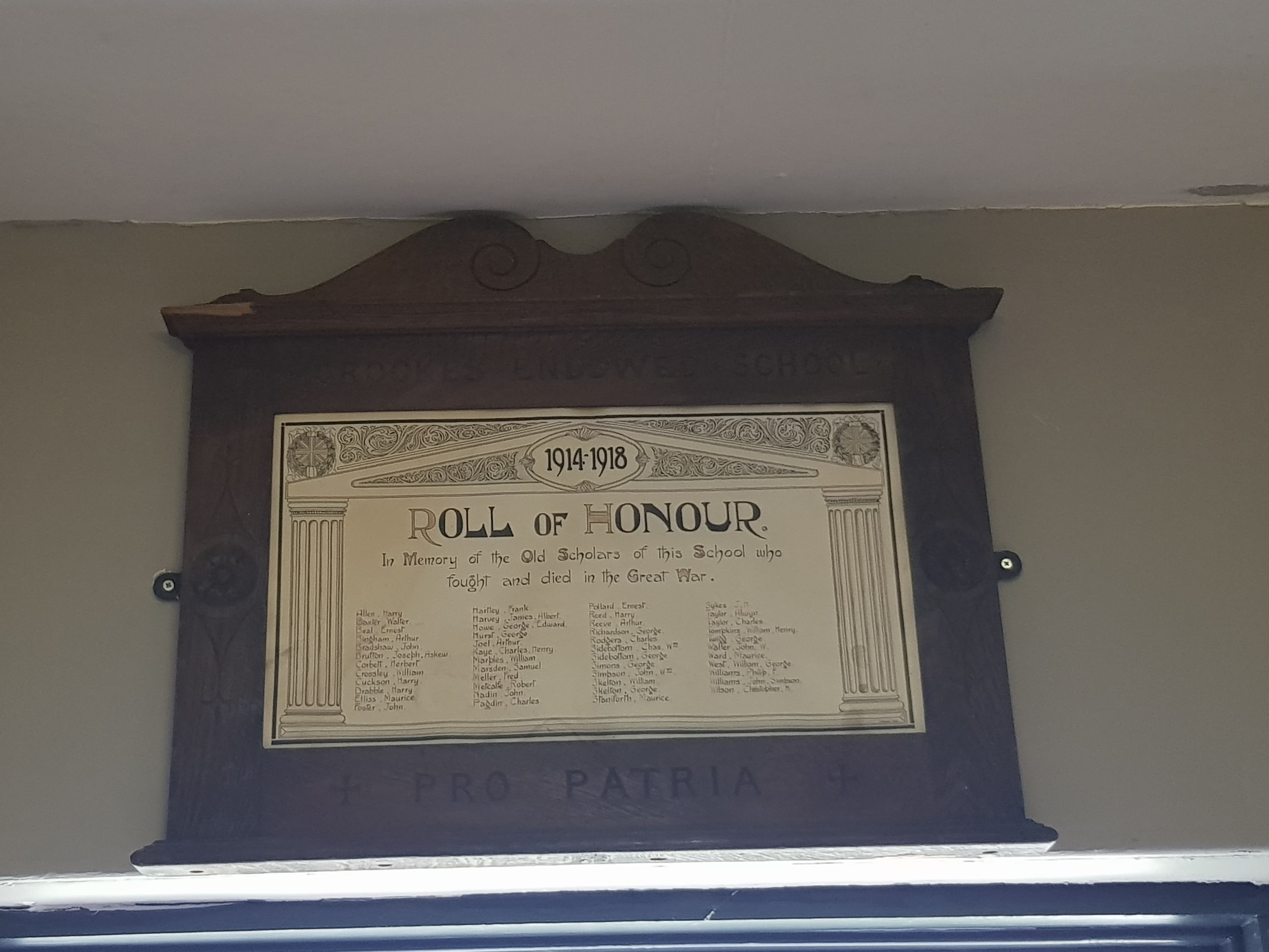 In August, 2018 Richard Godley forward a photo onto us of a Roll of honour Memorial that originated from Crookes Endowed School. The memorial was said to have been rescued from a skip, and is now on display in Barnsley.