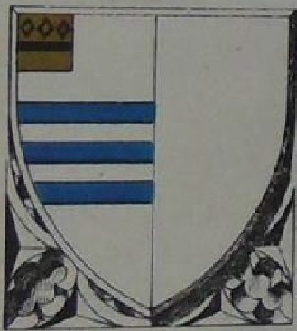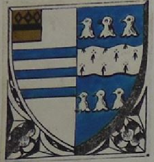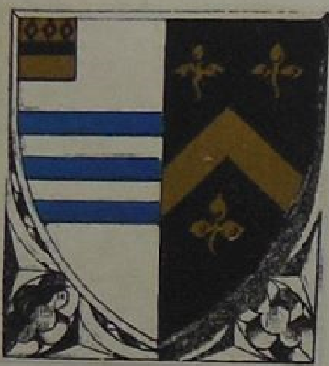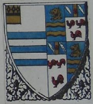 Mather Arms; Ermine, on a fesse wavy, azure, 3 lioncels rampant argt, langued gules, - impaling, for Femme; Argt, a chevron sable between 3 cinquefoils gules, for Checkley.