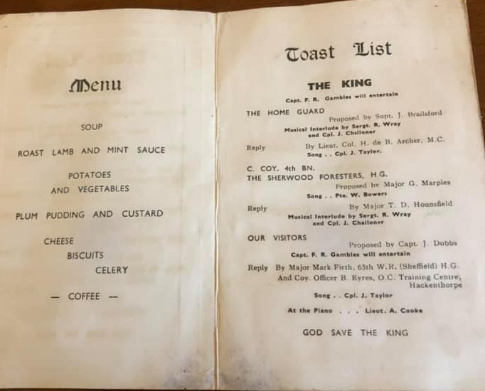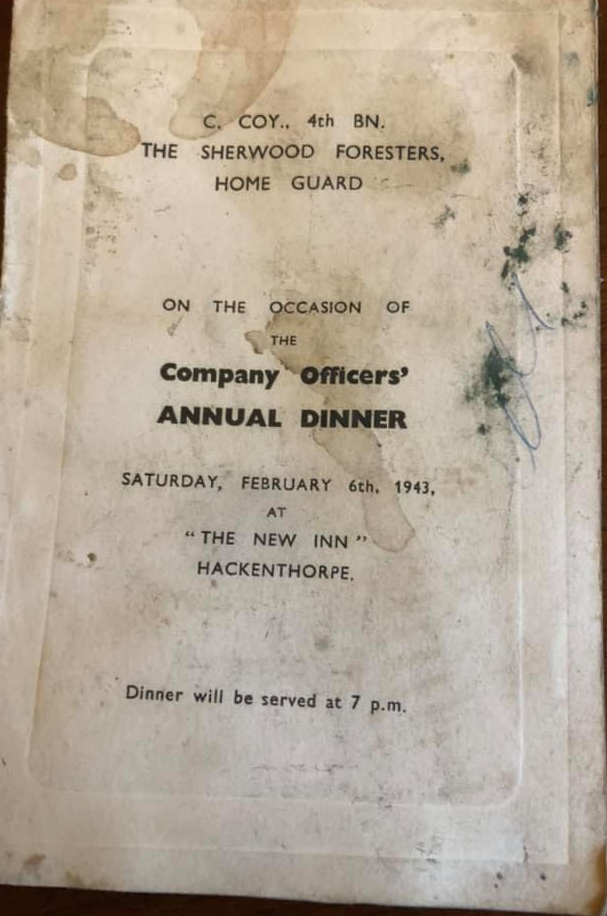 Menu from an event held at The New Inn in 1943 by the Sherwood Foresters Home Guard